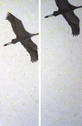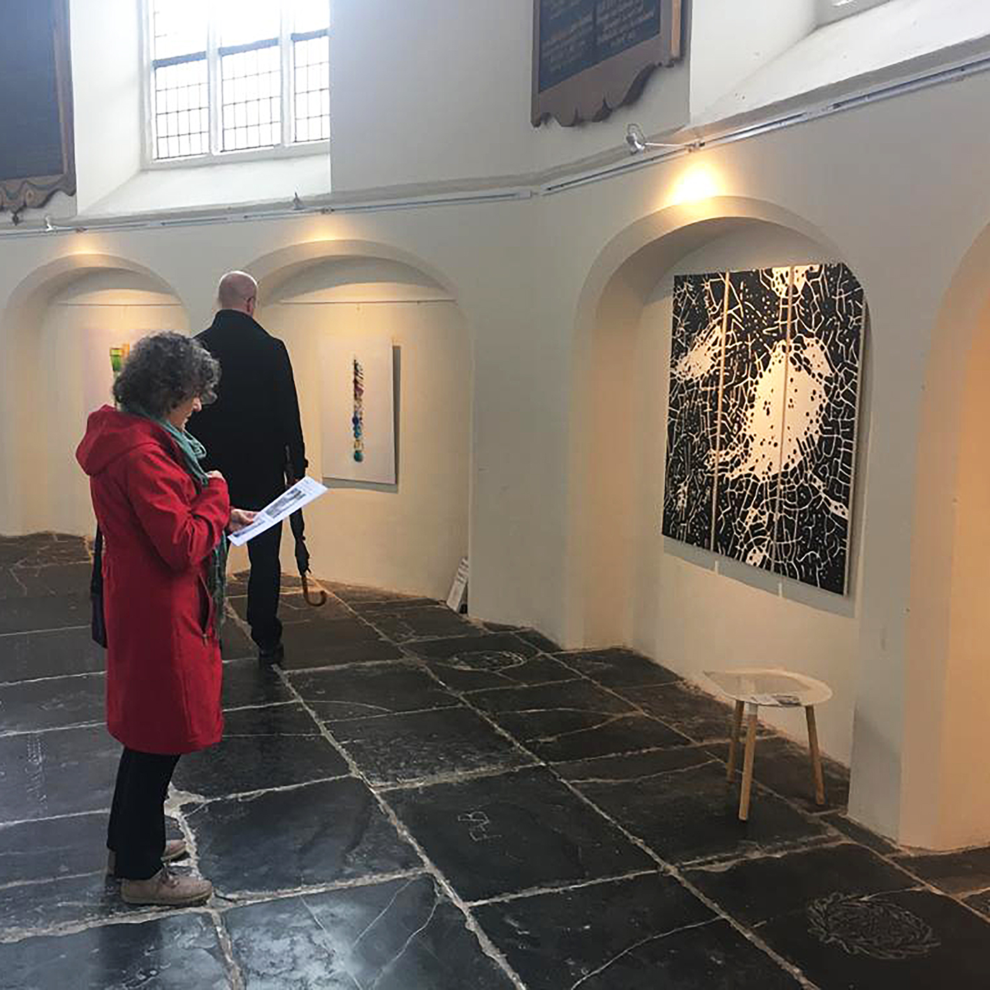 Groepsexpositie in de Grote- of Barbarakerk in Culemborg met het werk VRIJ? Tweeluik 40 x 120 cm inkt en papier (met geprinte teksten) op canvas.
