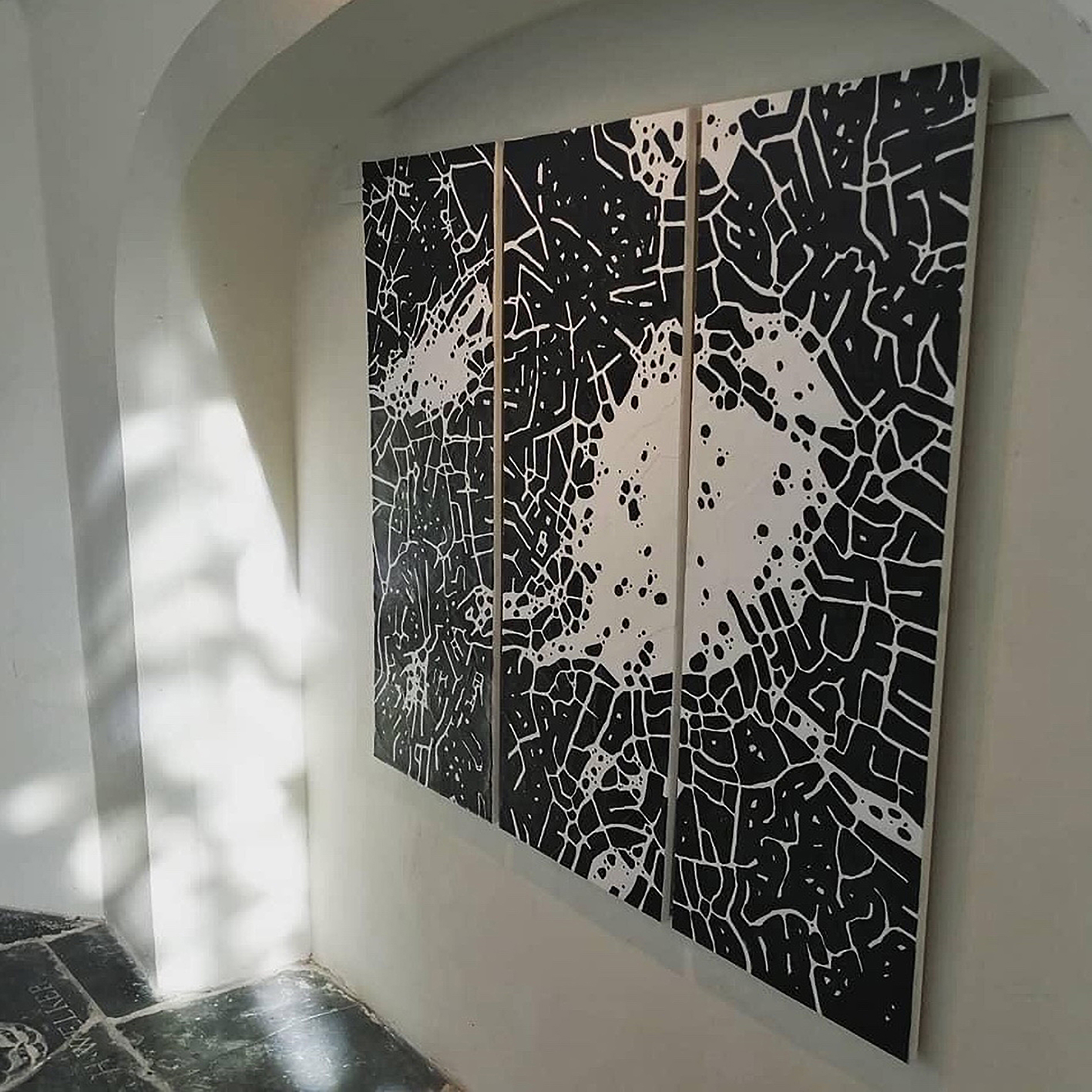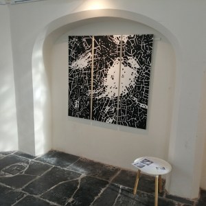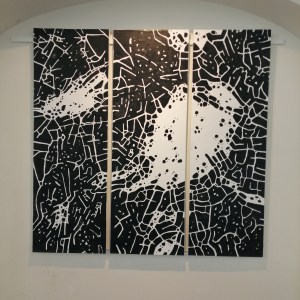 In de Grote- of Barbarakerk: drieluik 120×120 cm acryl op papier op canvas.